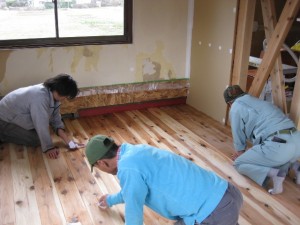 床は、授業で手をついたりできるように、3cm厚の秋田杉の無垢材に、なめても大丈夫なドイツ製のオイルを塗りこみました。