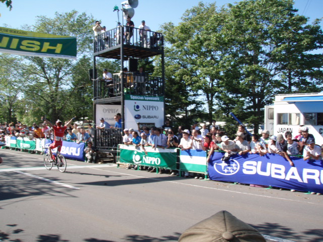 ゴールの運動公園には 今まで私は見たことの無いような数の応援の数で、ツールド北海道は普通自転車のことを知らない人でも「聞いたことはある」と必ず言うくらい、知名度が高いレースだそうで、ゴールした後、たくさんの外国人、プレス、ヘリコプター、一般の観客、まるでちょっとした有名なマラソン大会みたい、参加者以外の人でこれだけの人が来て、プロレースを応援するって、私は初めて目にしたので、すごいなぁと思いました。
