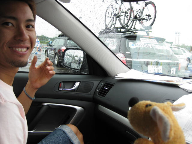 後部座席には、メカニックの中西さんが乗っていて、トラブルの時にはすぐに飛び出していけるよう準備しています。