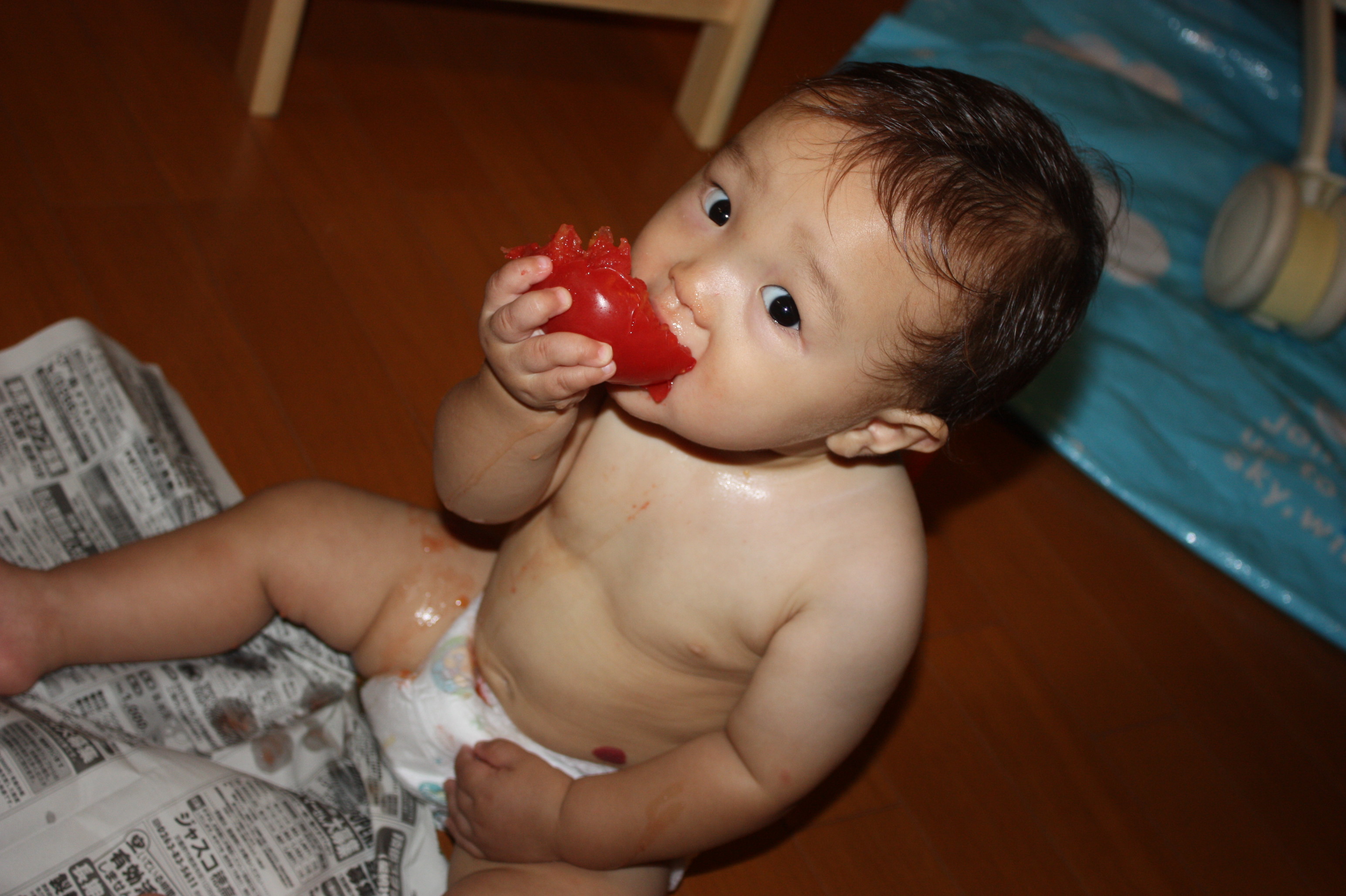 真っ赤に熟れたトマトを皮ごとむしゃぶりつく純くん・・・「健康」という言葉しか浮かんできませんね。(^^)