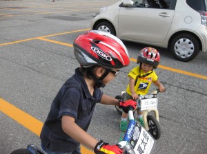 最初は全然エントリーしておらず、ただ、最近やまめ工房でも扱うことにした、木のキックバイクを持ってきて遊んでいただけだったのですが、知り合いの5歳のお兄ちゃんが乗っているのを見て、自分もず~っと後ろをついてやる気満々に。